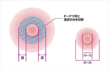 乳輪組織の大きいと思われる部分を切除する手術で、乳輪の大きさによって、下記の3通りの方法があります。