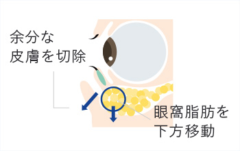 目の下の眼窩脂肪の絶対量が少なくなると、目の上の眼窩脂肪が下に落ち込むために起こります。