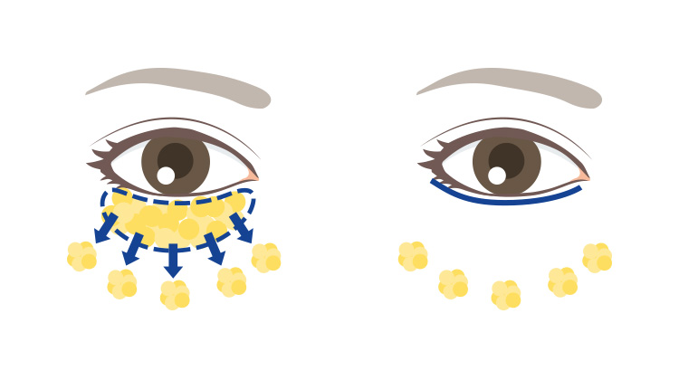- 突出した目袋とその下の凹みや溝が改善するだけでなく