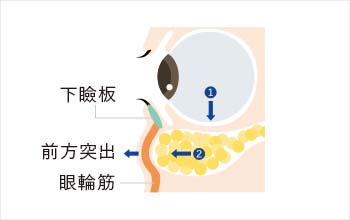 ③加齢による皮膚と眼輪筋のタルミにより更に前方に突出してきます