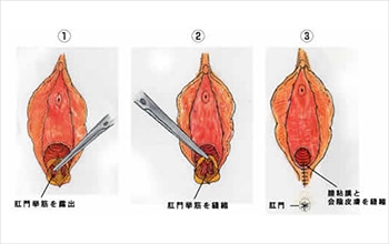 「肛門挙筋(括約筋)縫縮術」を行います。施術方法は図の通りです。まず膣粘膜会陰を切除します。その後さらに肛門挙筋(括約筋)を露出します。次に肛門挙筋を縫い合わせて縮め、さらに膣粘膜会陰を縫い合わせて縮めます。
